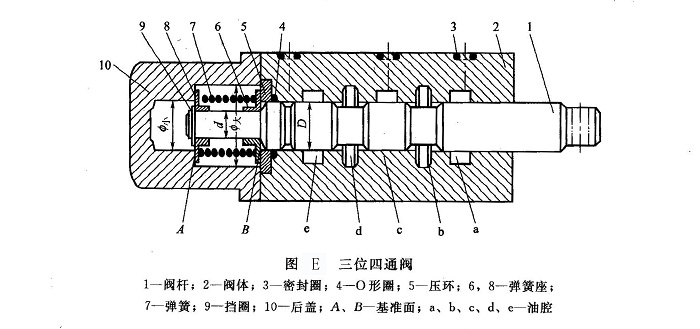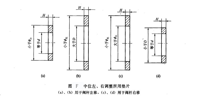 ②方法Ⅱ 若認(rèn)為采用方法I不便,可采用加圓墊片的方法確定閥桿倒角的準(zhǔn)確位置(見圖F)。預(yù)先加工出厚度分別為0.5mm和0.8mm的兩組圓墊片,每組一大一小共兩個(gè),大墊片用來移動(dòng)閥桿,小墊片用來防止閥桿竄動(dòng)。用于左移的大墊片內(nèi)徑略大于閥桿直徑D,外徑略小于或等于圖E中后蓋10的內(nèi)徑廬大;小墊片外徑略小于圖F中后蓋10的里端內(nèi)徑聲小,內(nèi)徑等于或略大于閥桿前端直徑d。如欲將閥桿中立位置左移,就將大墊片墊在彈簧座B基準(zhǔn)面后面,小墊片墊在彈簧座基準(zhǔn)面A后面(這樣,閥桿的中立位置就會(huì)左移,而閥桿仍能保持左右沒有自由竄動(dòng)量,如果只墊大墊片,閥桿就會(huì)有自由竄動(dòng)量);如欲將閥桿向右移動(dòng),就將大墊片墊在彈簧座基準(zhǔn)面A后面,將小墊片墊在彈簧座基準(zhǔn)面B后面,這樣,閥桿的中立位置就會(huì)向右移動(dòng)。每次加裝墊片后(左、右移動(dòng)各有2種厚度的墊片,共有4種狀態(tài))均須裝機(jī)試驗(yàn),最多4次就能找出閥桿上油槽阻礙低壓回油處(對應(yīng)a腔或b腔);然后,對阻擋回油的軸肩處進(jìn)行如同方法工那樣的倒角處理即可,但倒角后切不可忘記將所加的墊片取下來;如果加墊片后,閥桿的動(dòng)作正常,可暫時(shí)使用。