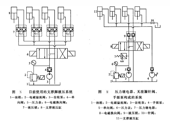 為了提高操作過程的自動(dòng)化程度,提高整車應(yīng)急處理能力,采用集中液壓鎖,通過壓力繼電器控制支撐腳的伸出(縮回),安裝無泄漏針閥,利用手搖泵應(yīng)急縮回支撐腳。如圖M所示,它具有以下優(yōu)點(diǎn)。