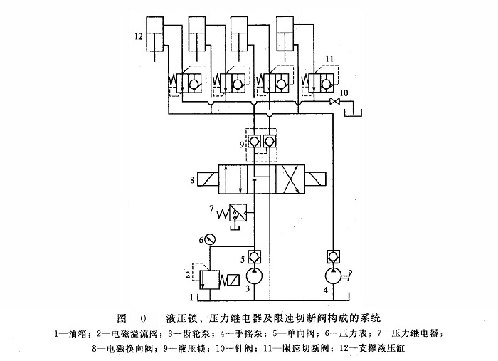 自采用圖O所示的集中液壓鎖、通過壓力繼電器控制支撐腳伸縮和加裝限速切斷閥的先進(jìn)系統(tǒng),飛機(jī)除冰車、登機(jī)客梯、飛機(jī)食品車、高空作業(yè)車等機(jī)場(chǎng)用設(shè)備再未發(fā)生延誤航班事故。