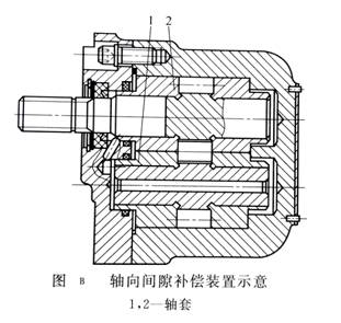 在中高壓齒輪泵中,為了減小軸向間隙泄漏,通常采用浮動(dòng)軸套或彈性側(cè)板對(duì)端面軸向間隙進(jìn)行自動(dòng)補(bǔ)償。圖B所示是采用浮動(dòng)軸套的一種典型的結(jié)構(gòu)。圖中軸套1和2是浮動(dòng)安裝的,軸套的左側(cè)容腔用特制的通道與泵的壓油腔相通。當(dāng)泵工作時(shí),軸套1和2受左側(cè)油壓的作用右移,貼靠在齒輪的端面上,壓力越高,貼的越緊,從而可以減小間隙并自動(dòng)補(bǔ)償端面磨損量。實(shí)踐證明,這樣能取得較好的效果。