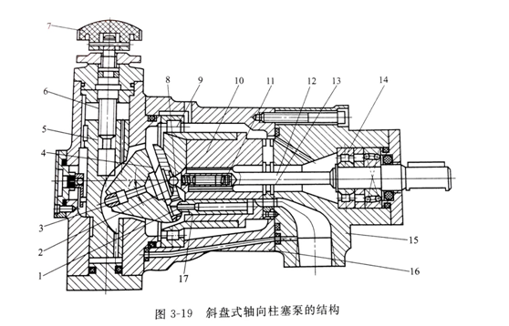 如圖3-19所示為常用的一種斜盤式軸向柱塞泵的典型結(jié)構(gòu),它可分為兩大部分:右邊的主體部分和左邊的變量部分。