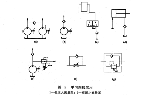 ②區(qū)分高、低壓力油,防止高壓油進(jìn)入低壓系統(tǒng)。有些液壓系統(tǒng)同:時采用高壓小流量泵和低壓大流量泵向系統(tǒng)供油,如圖E(a)所示。當(dāng)高壓回路空載時,低壓泵1經(jīng)單向閥與高壓泵2同時供油。當(dāng)高壓系統(tǒng)壓力升高,并高于低壓系統(tǒng)壓力時,高壓油將單向閥關(guān)閉,只用高壓泵供油。