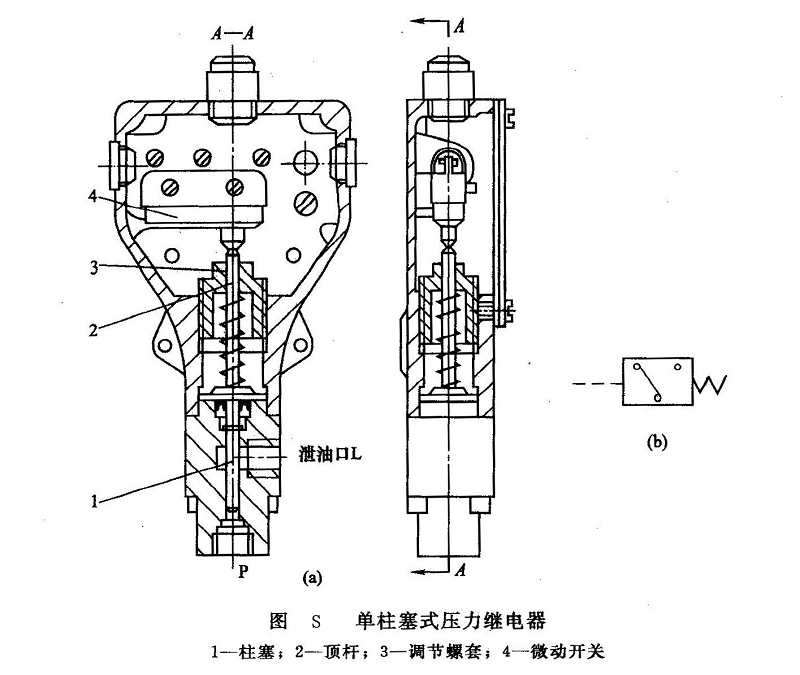 結(jié)構(gòu)與工作原理 圖S所示為單柱塞式壓力繼電器的結(jié)構(gòu)及其職能符號(hào)??刂瓶?span lang="EN-US">P和液壓系統(tǒng)相連,當(dāng)系統(tǒng)壓力達(dá)到調(diào)定值時(shí),作用于柱塞1上的液壓力克服彈簧力,頂桿2上推,使微動(dòng)開(kāi)關(guān)4的觸點(diǎn)閉合,發(fā)出電信號(hào);當(dāng)系統(tǒng)壓力下降,彈簧力將柱塞下推,使微動(dòng)開(kāi)關(guān)的觸點(diǎn)斷開(kāi),電信號(hào)消失。
