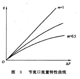 式(5-1)即為節(jié)流口的流量特性方程,相應(yīng)的流量特性曲線如圖B所示。