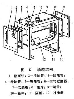 開(kāi)式油箱的典型結(jié)構(gòu)如圖K所示。隔板11將吸油管5和回油管3、泄油管4隔開(kāi)。頂部、側(cè)部及底部分別裝有空氣過(guò)濾器6、注油管2、液面針1以及過(guò)濾器12。安裝液壓泵及其驅(qū)動(dòng)電動(dòng)機(jī)的安裝板7可固定在油箱的頂面上。油箱的箱體10通常用2.5~5mm鋼板焊接而成。