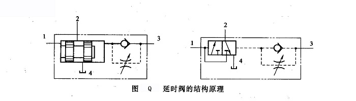 圖Q所示為延時(shí)閥的結(jié)構(gòu)原理。它由單向節(jié)流閥和二位三通液動(dòng)換向閥組成。當(dāng)油口1通人壓力油時(shí),閥芯向右運(yùn)動(dòng),將其右端油腔中的油液經(jīng)節(jié)流閥排出后,油口1、2才能接通。故油口1和2是延時(shí)接通的。調(diào)節(jié)節(jié)流閥開(kāi)口的大小,就改變了油口1和2延時(shí)接通的時(shí)間。