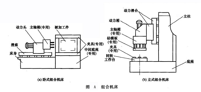 組合機床(圖A)是一種高效率的機械加工專用機床,這種機床既可以單機使用,也可以多機配套組成加工自動線。它由一些通用部件(如動力頭、滑臺、床身、立柱、底座、回轉工作臺等)和少量的專用部件(如主軸箱、夾具等)組成,有臥式、立式等多種結構形式。其加工范圍較寬,能完成鉆、擴、鉸、鏜、銑、攻螺紋等工序和工作臺的轉位、定位、夾緊和輸送等輔助動作,自動化程度較高。在機械制造業(yè)的成批和大量生產中得到了廣泛的應用。