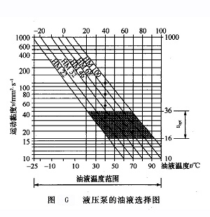 用戶也可按泵生產廠在產品樣本中提供的油液選擇圖來選用工作介質。圖G所示為某液壓泵的油液選擇圖,它給出了液壓油液的溫度范圍(橫坐標)(-25~90℃)、運動黏度的限制范圍(縱坐標)(lO~lOOOmm2/s)和最佳工作黏度范圍(vopt)(圖中的陰影部分)(vopt=16~36mm2/s)。最小黏度vmin=10mm2/s為短時間在90℃油溫下的黏度,最大黏度Vmax=lOOOmm2/s為短時冷啟動的黏度。為了正確選擇液壓油液,必須事先已知(算得)液壓系統(tǒng)的油箱中油液的工作溫度(開式回路)和環(huán)境溫度的關系。所選擇的油液,應保證在工作溫度范圍內,工作黏度處于最佳范圍(vopt),一般每種場合均應選用可能高的黏度等級。例如,某環(huán)境溫度下,油箱工作油液的溫度為60℃,在最佳工作黏度范圍(vopt)內對應的黏度有HM46和HM68,則選HM68液壓油液。利用油液選擇圖時應注意:殼體泄油溫度受泵的工作壓力和轉速的影響并不總是高于油箱油溫。但系統(tǒng)任何部位的最高溫度均不得高于90℃。