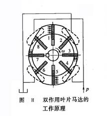 以雙作用葉片馬達(圖H)為例,說明葉片馬達的工作原理。由圖H可見,葉片1~8將前、后端蓋和轉(zhuǎn)子及定子間形成的環(huán)狀空間沿圓周分割為與葉片數(shù)量相同的密封工作腔,當壓力油通過配流盤左上角和右下角的兩個進油窗口進入密封工作腔后,葉片1、3、5、7的一側(cè)受到油壓p作用,另一側(cè)通過左下角和右上角的排油窗口回油;而葉片2、4、6、8兩側(cè)壓力相同。由于葉片1的承壓面積大于葉片7的承壓面積,因此便產(chǎn)生轉(zhuǎn)矩。同理,葉片5的承壓面積大于葉片3的承壓面積,也產(chǎn)生轉(zhuǎn)矩。其合成轉(zhuǎn)矩驅(qū)動轉(zhuǎn)子以角速度ω順時針方向旋轉(zhuǎn),輸出機械能。