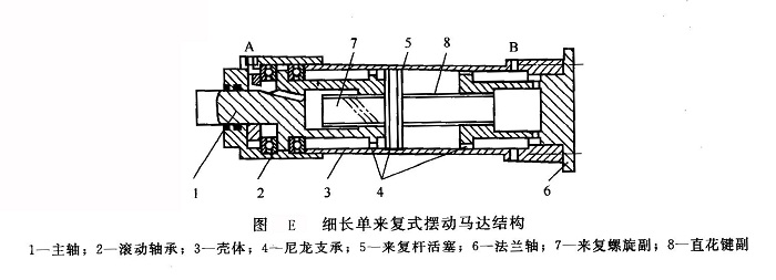 ②細長單來復式擺動馬達(圖E) 這是一種用于臺車鉆臂上翻轉(zhuǎn)鑿巖機滑道的單來復式擺動馬達。其活塞5上的來復桿與主軸1上的來復螺旋副相配,主軸又與滑道相連,殼體3通過法蘭軸6固定于鉆臂上。當壓力油從油口A進入殼體左腔時,活塞沿著直花鍵副8向右運動。由于鉆臂不動,所以活塞直線運動時,通過來復螺旋副7迫使主軸連同滑道一起旋轉(zhuǎn)。反之,壓力油由B油口進入時,滑道就反轉(zhuǎn)。這種馬達的優(yōu)點是能帶動細長工作機構(gòu)旋轉(zhuǎn)。