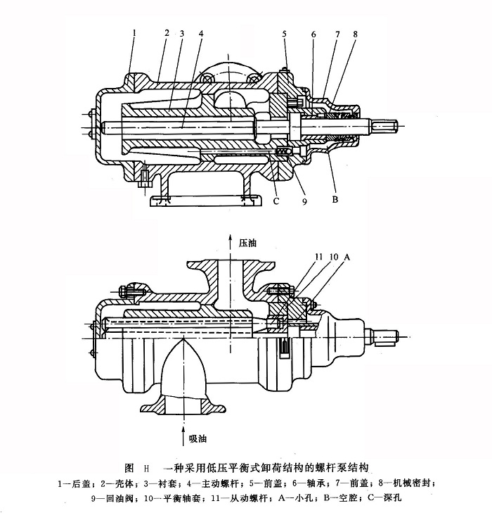 圖H所示為采用低壓平衡式卸荷結(jié)構(gòu)的螺桿泵結(jié)構(gòu)。處于高壓腔的螺桿平衡活塞的端部腔室經(jīng)小孔A、前蓋7的空腔B、回油閥9、襯套深孔C與低壓腔相通,使螺桿的軸向力得到平衡。其中回油閥9的作用是使平衡活塞的端部腔室及空腔B保持較小的背壓,以免該處和吸油腔一樣處于真空狀態(tài),使該處滑動軸承的潤滑油膜遭到破壞。