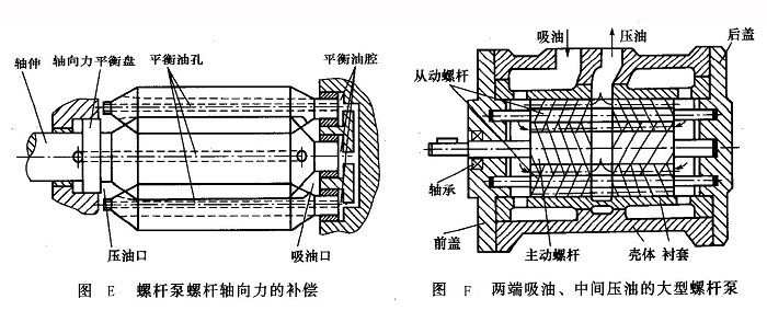 ⅴ.對(duì)于大規(guī)格的螺桿泵常制成雙吸型(圖F),即兩端吸油、中間壓油,采用一對(duì)螺旋方向相反的螺桿副可使主動(dòng)螺桿上的軸向力幾乎完全平衡。