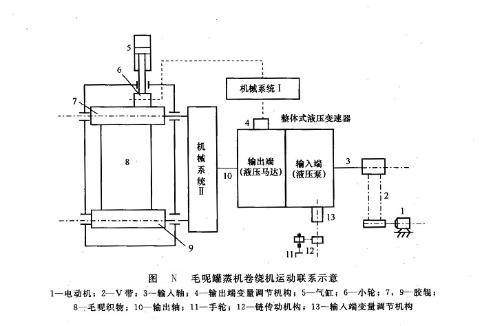 ①功能、結(jié)構(gòu)及故障現(xiàn)象毛呢罐蒸機(jī)是從英國Saler公司引進(jìn)的一種紡織設(shè)備,由卷繞機(jī)和罐蒸器兩部分組成,用于毛呢織物的卷繞和罐蒸,以提高產(chǎn)品美觀度:卷繞機(jī)由一整體式液壓變速器驅(qū)動(dòng)和控制(圖N),其主要功能是將經(jīng)剪絨之后卷在膠輥9上的毛呢織物均勻地卷繞到膠輥7上。按卷繞工藝,要求該液壓變速器能通過由齒輪、同歲齒形帶等機(jī)構(gòu)零件組成的機(jī)械系統(tǒng)Ⅱ正、反向啟動(dòng)膠輥9及7,且能通過該變速器輸入和輸出端的變量調(diào)節(jié)機(jī)構(gòu)使兩個(gè)膠輥的轉(zhuǎn)速從0~1500r/min得到無級(jí)調(diào)節(jié),同時(shí)還能通過起反饋?zhàn)饔玫臋C(jī)械系統(tǒng)I與氣缸5及小輪6的配合,使兩個(gè)膠輥之間的織物的線速度基本恒定,以保證適當(dāng)張力,實(shí)現(xiàn)均勻卷繞。